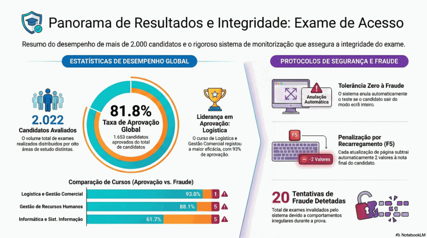 • Totalizadores globais (ex: 2022 avaliados num dos períodos registados, com 81.8% de aprovação e 20 tentativas de fraude).